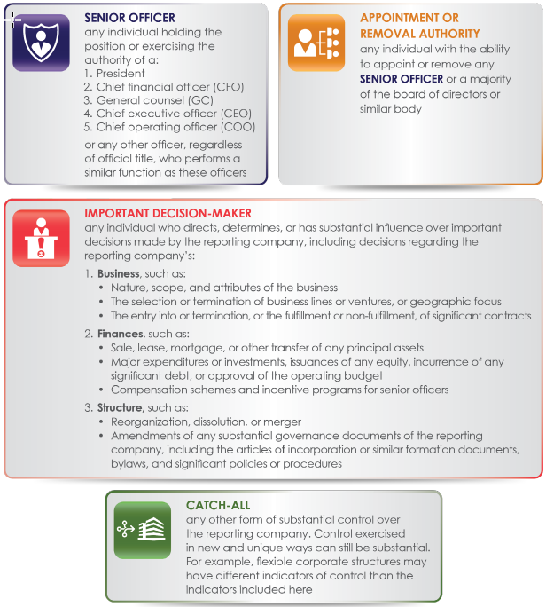 Reporting companies are required to identify all individuals who exercise substantial control over the company. There is no limit to the number of individuals who can be reported for exercising substantial control. An individual exercises substantial control over a reporting company if the individual meets any of four general criteria: (1) the individual is a senior officer; (2) the individual has authority to appoint or remove certain officers or a majority of directors of the reporting company; (3) the individual is an important decision-maker; or (4) the individual has any other form of substantial control over the reporting company. See the chart below for details about these criteria.