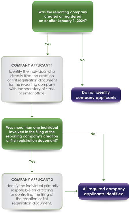 Each reporting company that is required to report company applicants will have to identify and report to FinCEN at least one company applicant, and at most two. All company applicants must be individuals. Companies or legal entities cannot be company applicants.