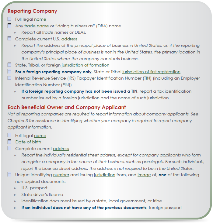 The following checklists may help you identify the information about your company and its beneficial owners and company applicants that you are required to collect and report.